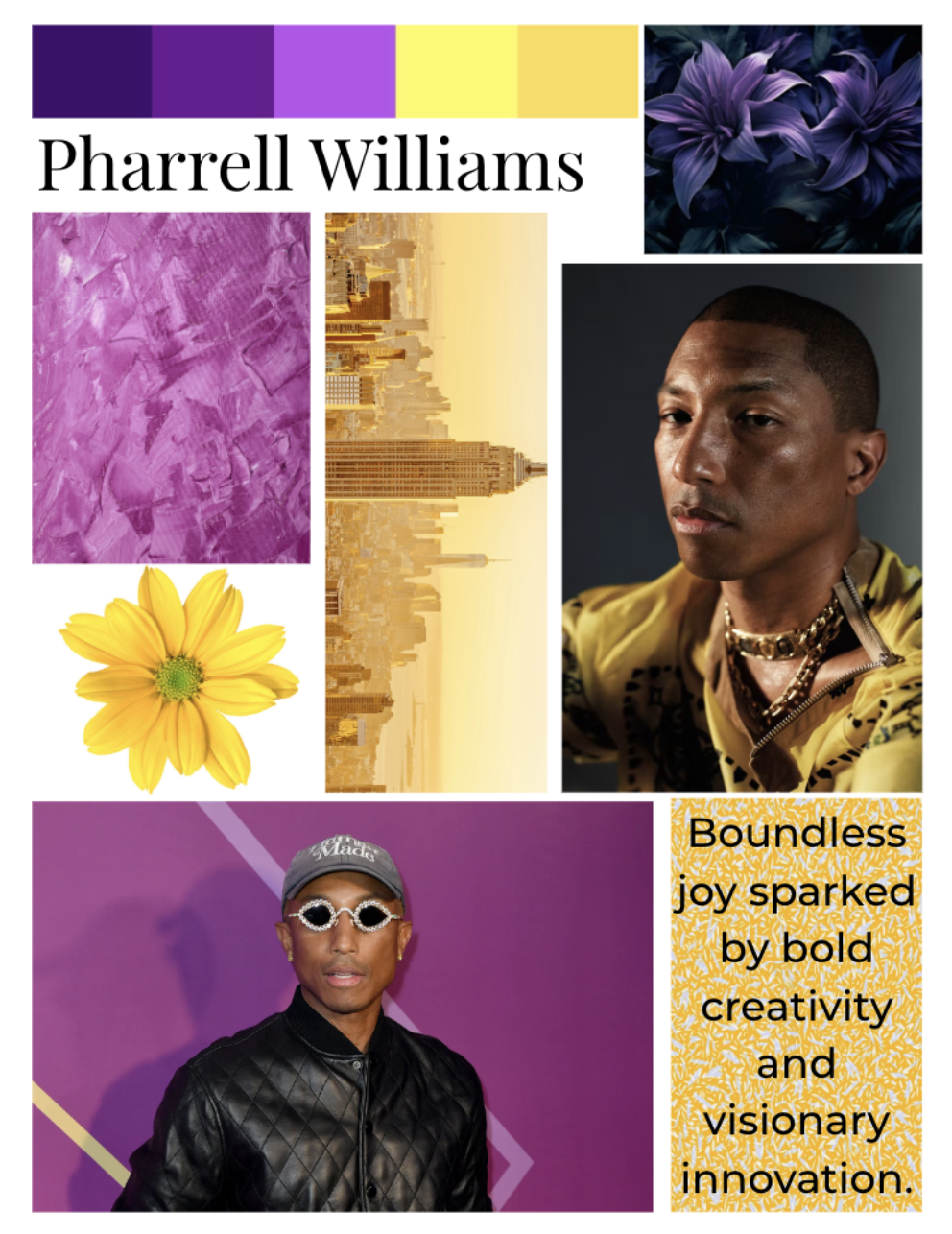 Created in Canva, this moodboard captures the vibrant energy and creative personality of Pharrell Williams. The design uses yellow to reflect his upbeat and optimistic nature, paired with purple to bring depth and contrast to his artistic side. Featuring a photo of Pharrell in yellow, a yellow-toned city image, a purple texture, and complementary flowers in both hues, the composition creates a balance between warmth and sophistication. The color palette unites these elements into a cohesive visual that represents his bold and inspiring identity.