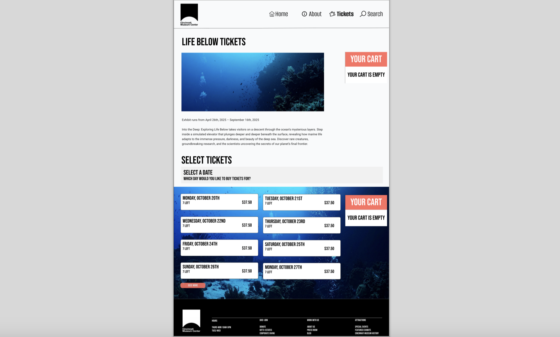 This ticketing page was designed in Figma to create a clear and engaging way for visitors to plan their experience. The layout combines simplicity and function, using organized date selections, pricing, and an interactive cart system. Consistent underwater imagery ties it visually to the rest of the exhibit’s identity, while clean typography and intuitive structure make it easy to navigate. The design focuses on maintaining a cohesive visual flow while giving users a seamless and efficient ticket-purchasing experience.