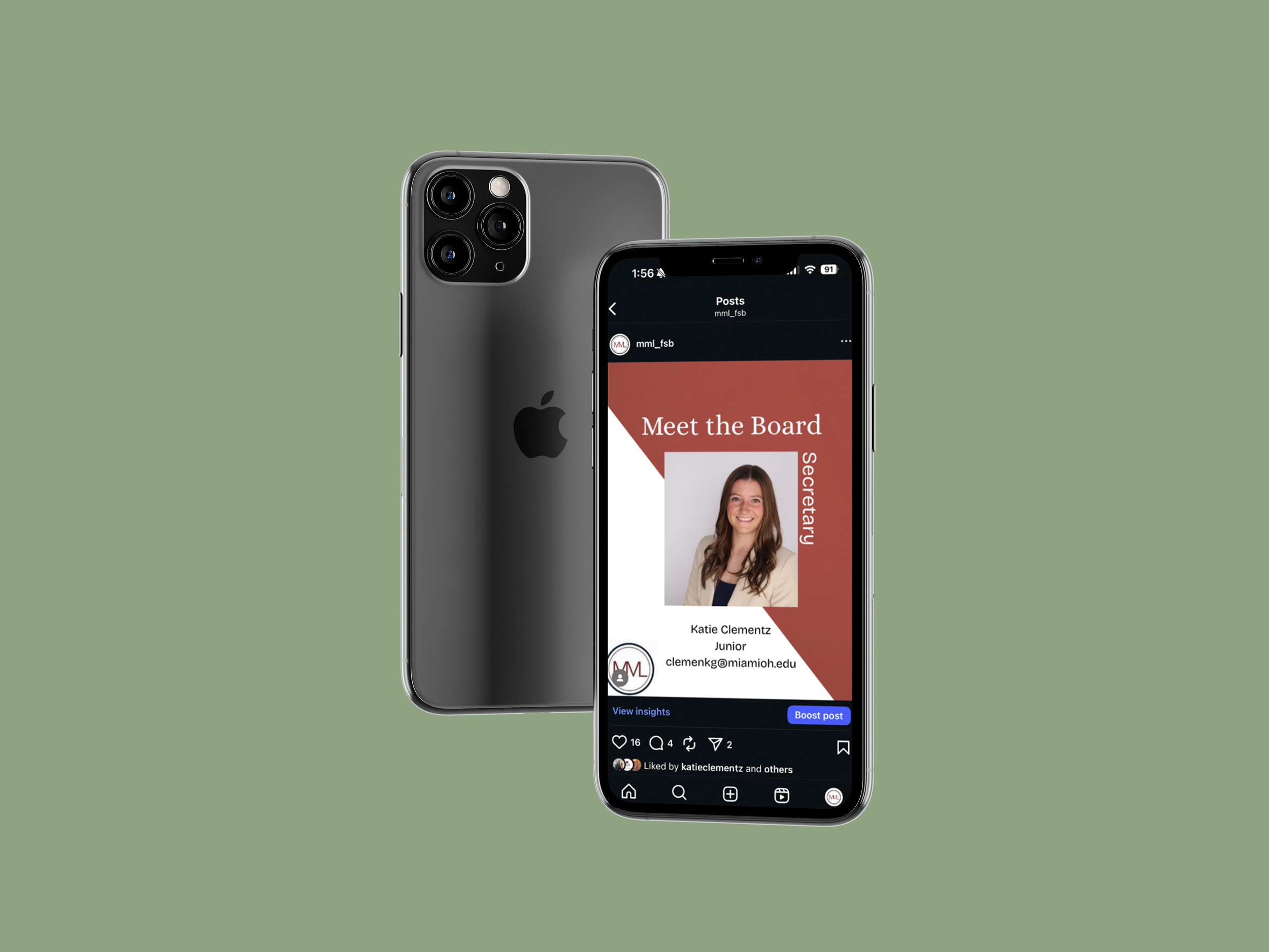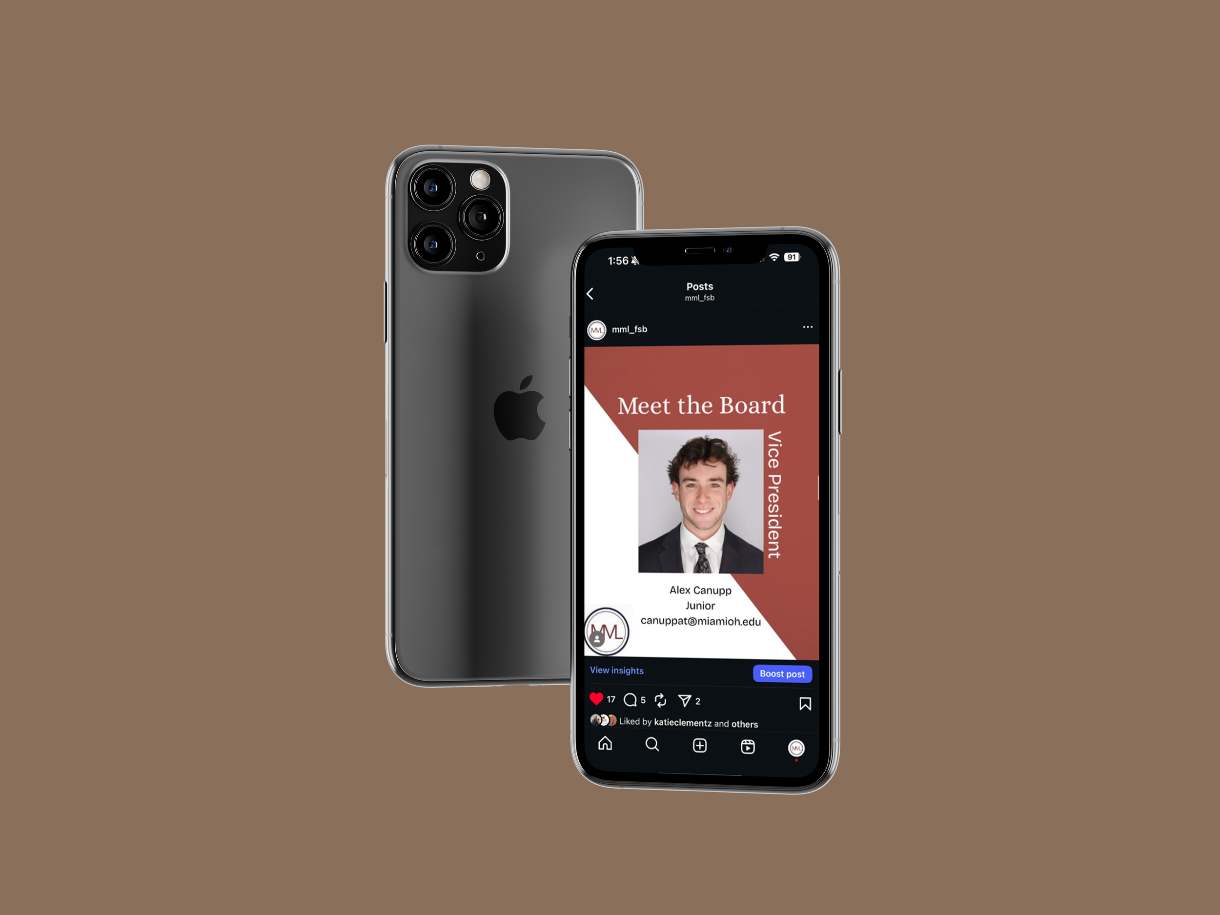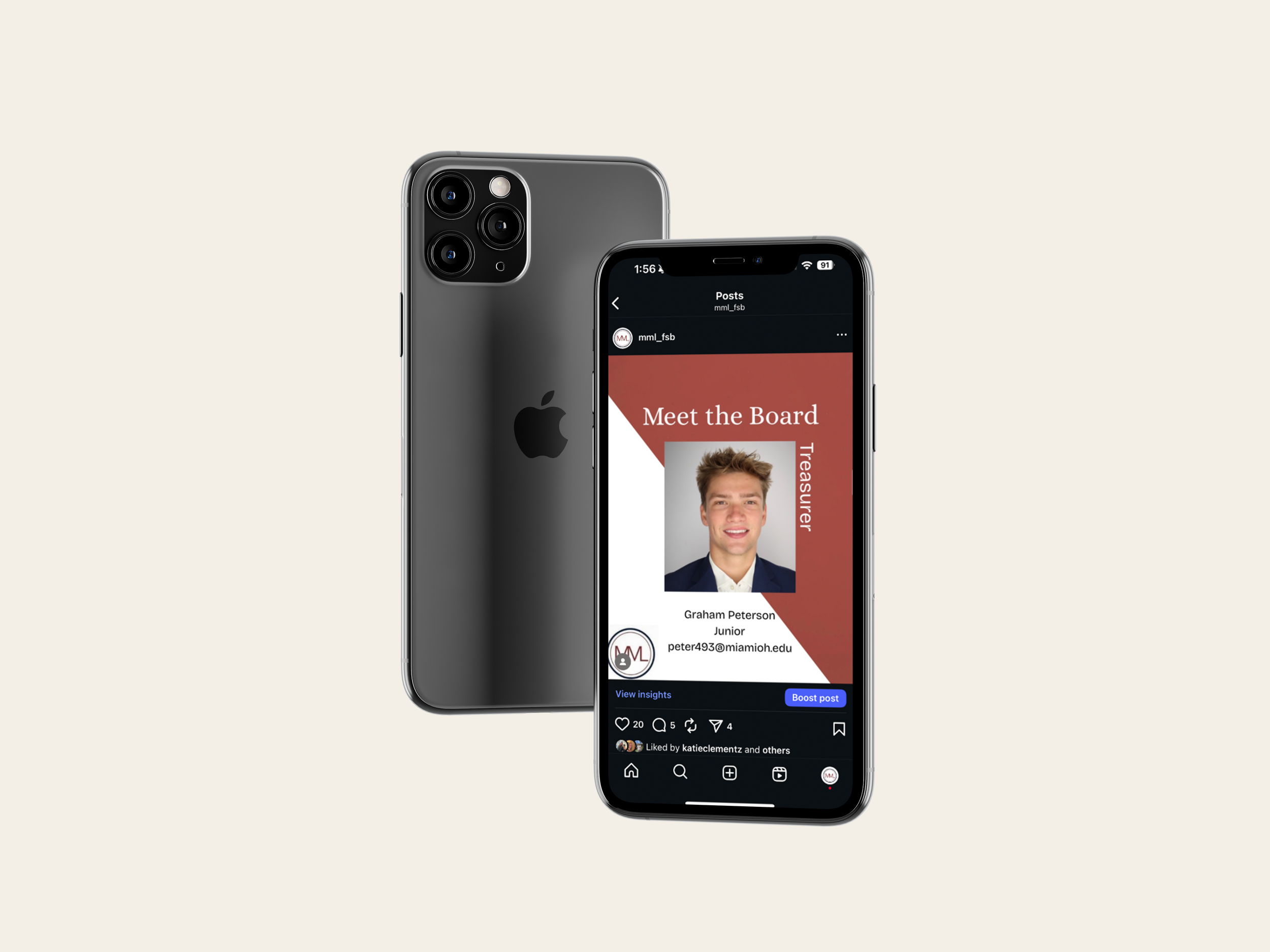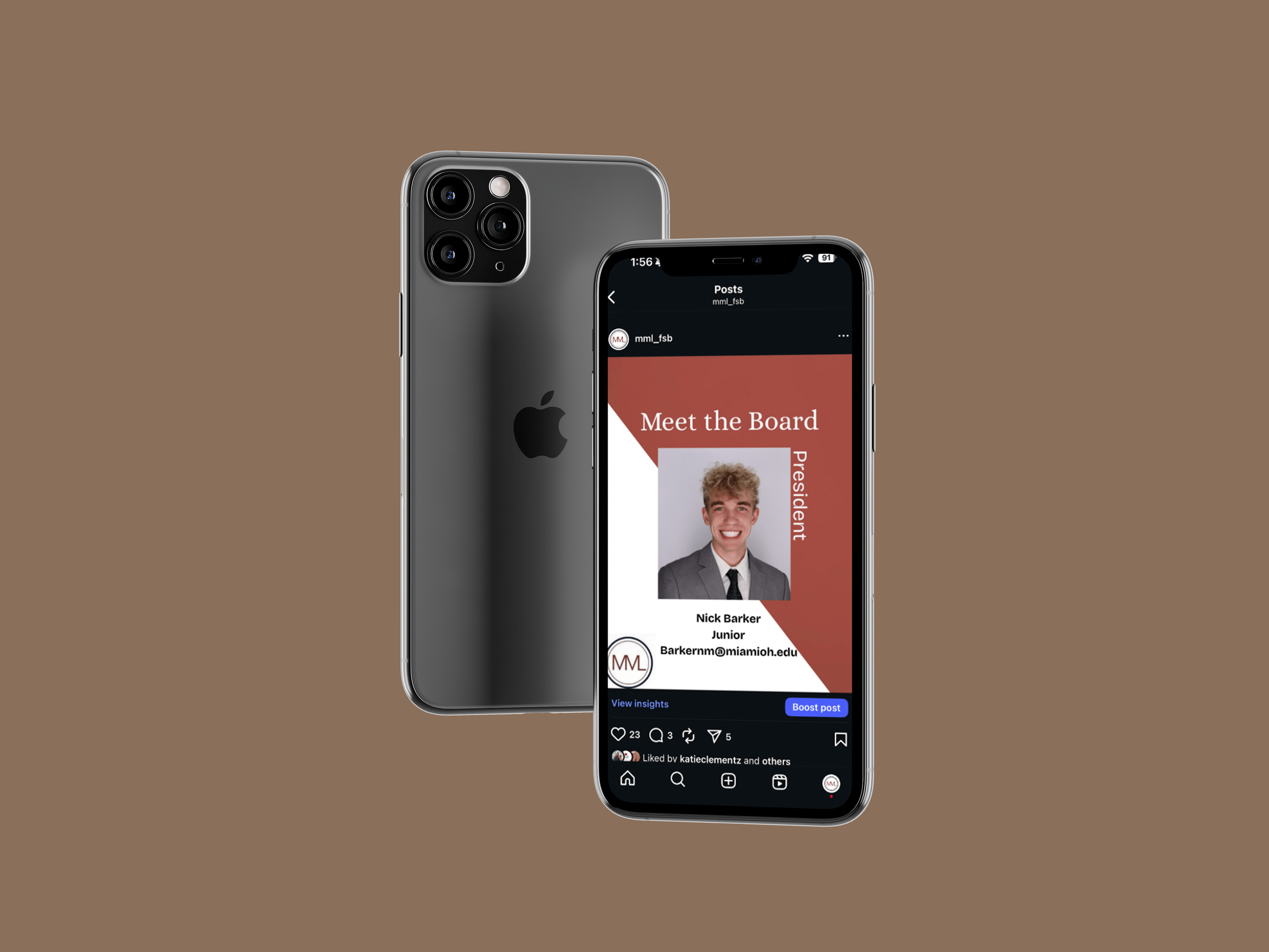 I created these posts in Canva, where I built a consistent layout and look for the executive board series. For other content, I took photos during meetings and used those to make recap posts that felt more real and tied to the club’s events. I also edited a short reel from a Poppi-sponsored meeting in CapCut and made a story post using a meme format to keep the content more fun and relatable. To present everything in a cleaner way for my portfolio, I placed the final posts into phone mockups in Photoshop. Overall, this project shows both the design side and the more day-to-day process of creating content for an organization’s social media.